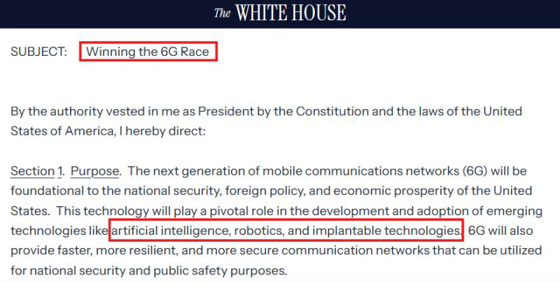 The White House memo entitled “Winning the 6G Race” dated December 19, 2025, is being sold as a straight telecommunications and competitiveness move, the kind of thing most people will file under “faster networks.” But the memo itself tells you what the next step is. In Section 1, it says 6G will play “a pivotal role” in the development and adoption of emerging technologies like artificial intelligence, robotics, and “implantable technologies.” That’s not a blog rumor or a fringe paraphrase. That phrase is in the official text. This is not a “conspiracy theory.”